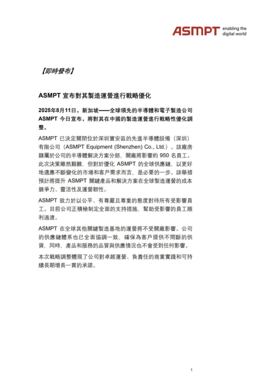 ASMPT称,该举措预计将提升ASMPT关键产品和解决方案在全球制造运营的成本竞争力、灵活性及运营韧性。同时强调,ASMPT在全球其他关键制造基地的运营将不受关厂影响。公司的供应链体系已全面协调一致,确保为客户提供不间断的供货。同时,产品和服务的品质与供应情况不会受到影响。
