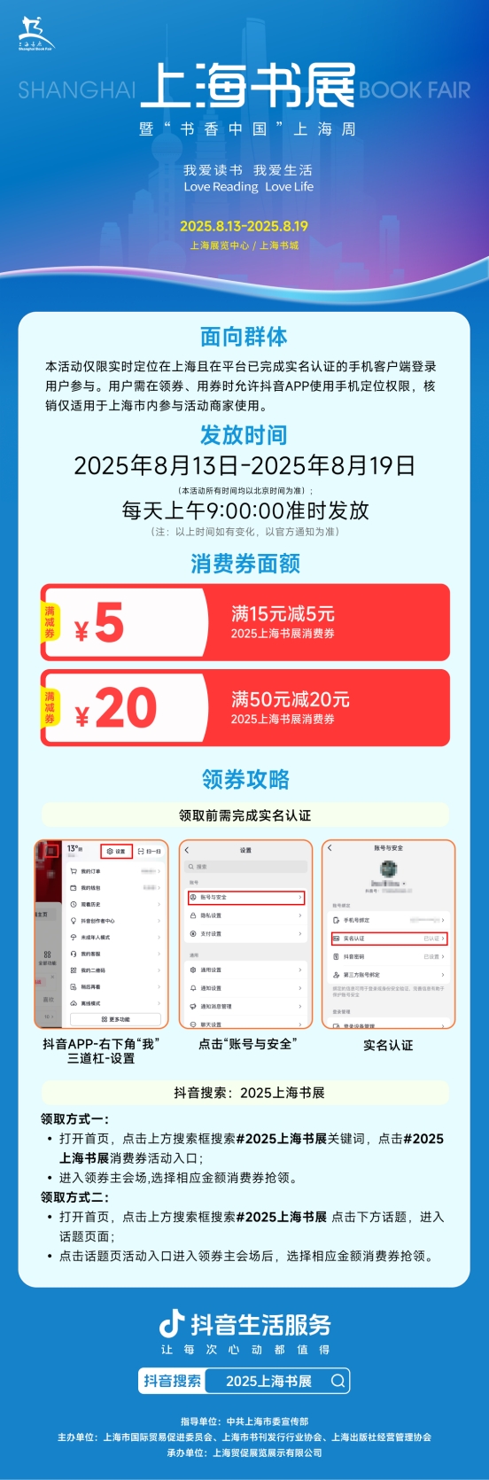 目前,“惠民阅读券”已经在抖音上线。网友在抖音搜索“2025上海书展”可以进入领券主会场,也可以通过抖音#2025上海书展 话题页入口进入活动主会场抢领。