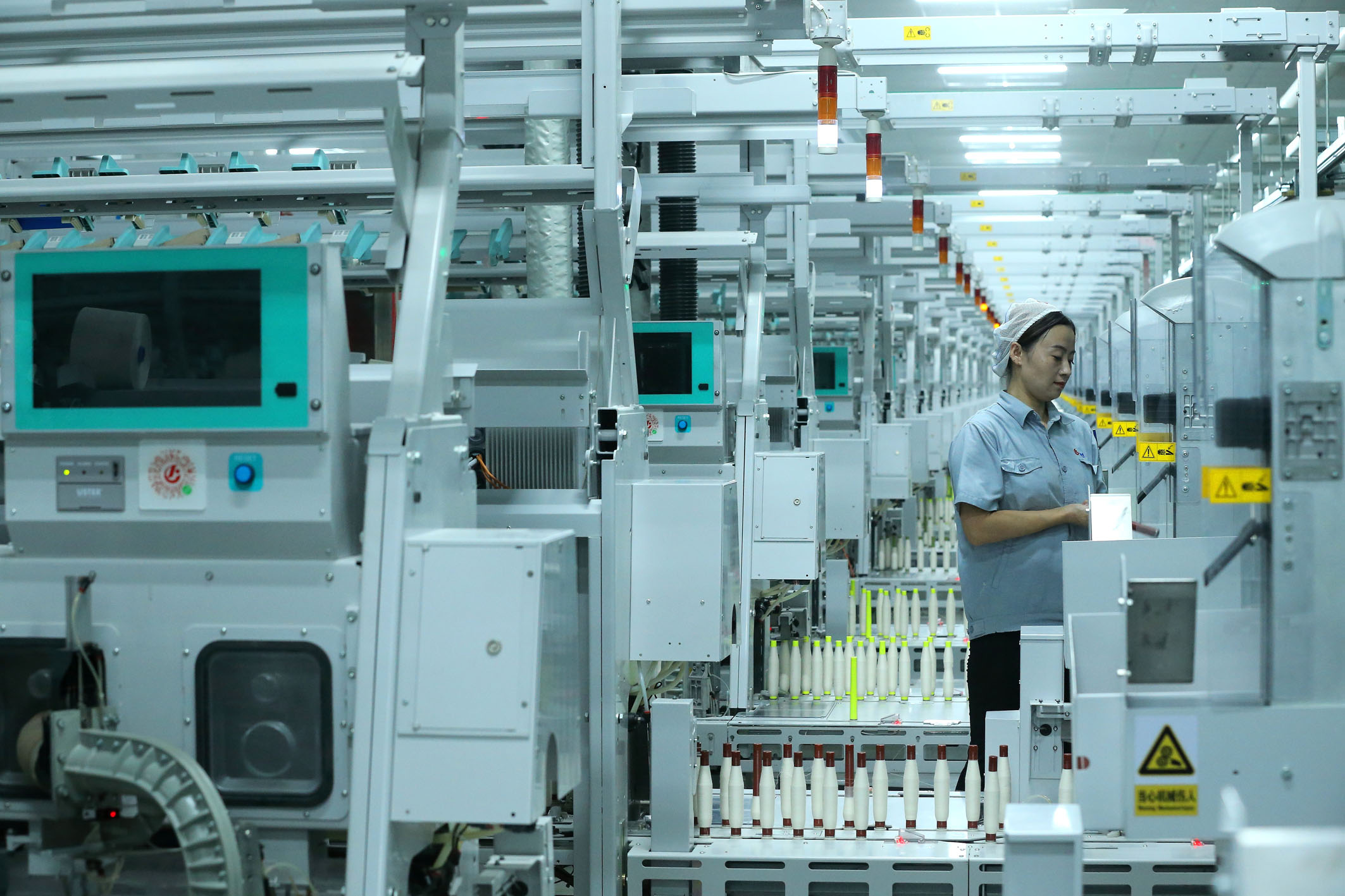 图为青岛市即墨区一家科技纺织企业的工人在智慧纺纱生产线上工作。 新华社发(梁孝鹏 摄)