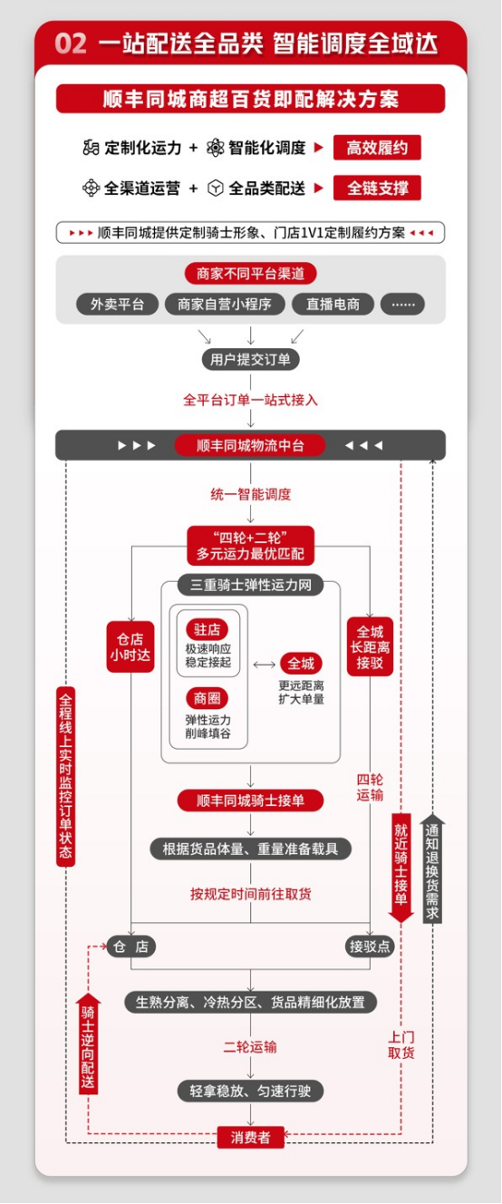 基于各大品牌的核心需求,第三方即时配送平台顺丰同城推出商超百货即配解决方案。针对商家自配送或平台配送模式的痛点,顺丰同城依托多元运力结合定制服务,提供全渠道配送支撑,助力其拓宽服务半径、升级服务体验,提升差异化市场竞争力。