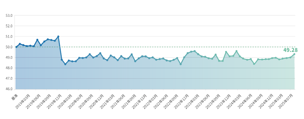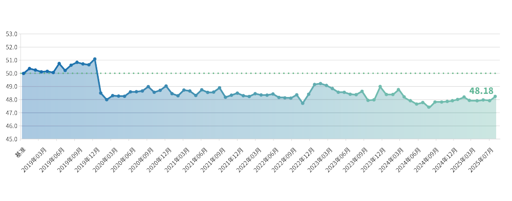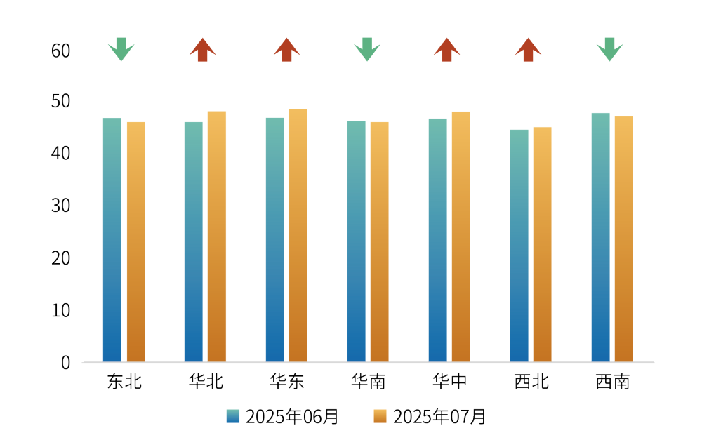 分区域来看,7月七大区域经营景气度指数4升3降。其中,华北、华东、华中和西北地区指数有所上升,分别为47.78、48.19、47.74和44.74点,东北、华南和西南地区指数有所下降,分别为45.74、45.71和46.94点。