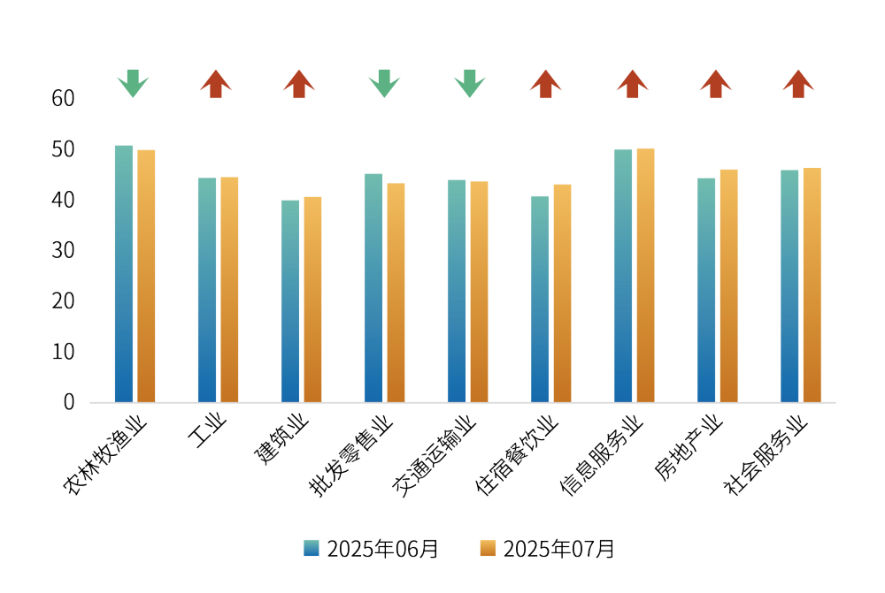 分行业来看,7月九大行业经营景气度指数6升3降。其中,工业经营景气度上升,制造业企业生产活动有所扩张。得益于暑期旅游旺季和一系列提振消费政策与举措的刺激,住宿餐饮业和社会服务业消费有所增长。信息服务业经营景气度微升,显示数字经济持续稳健发展。建筑业经营景气度增长。多地政策加码激活楼市,房地产市场活跃度不断提升。农林牧渔业、批发零售业、交通运输业经营景气度有所下降。