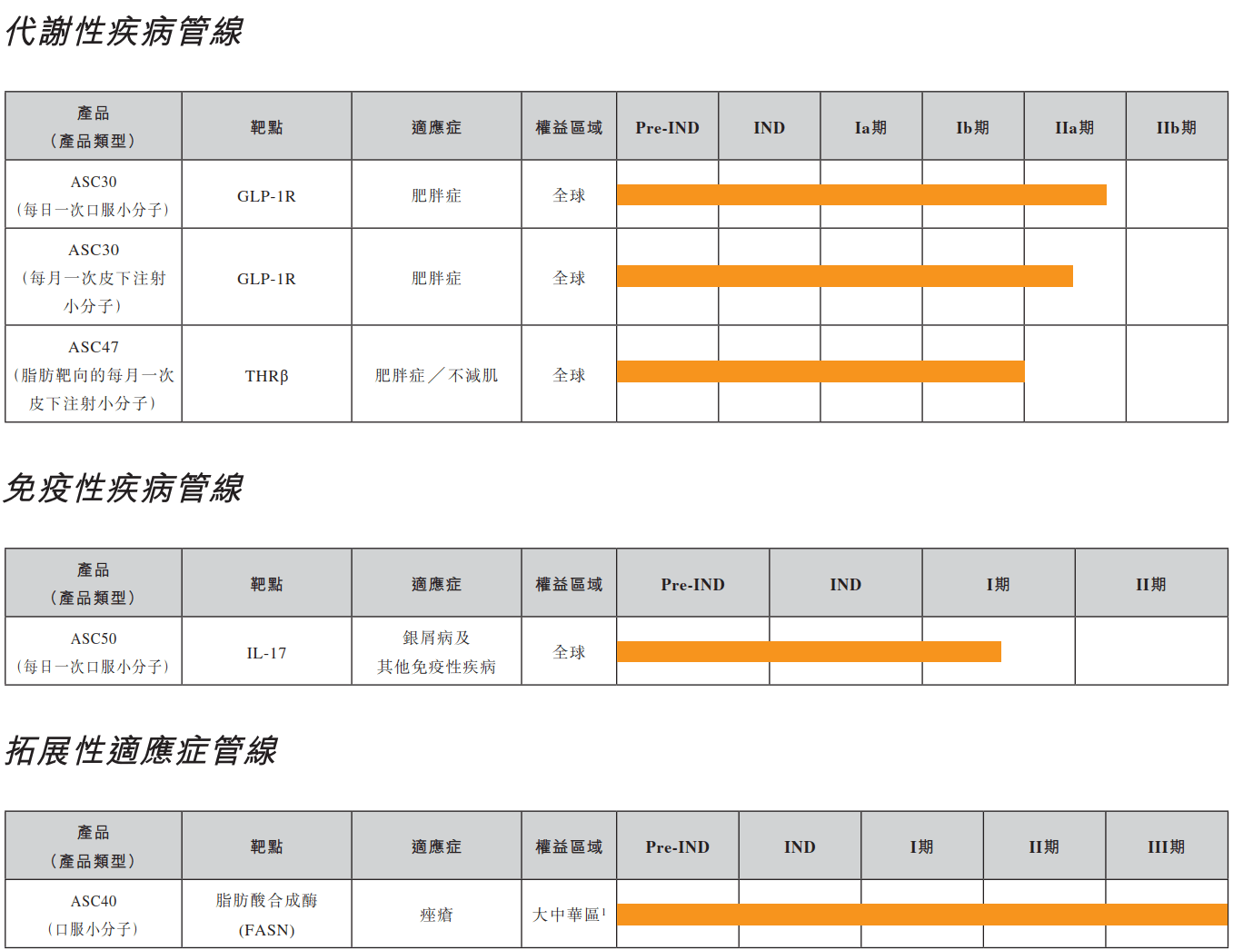 自2024年起,公司将研发重心转向减肥药。2024年9月17日,公司宣布其自主研发的小分子GLP-1R激动剂ASC30已在美国启动每日一次口服片剂和每月一次皮下注射两项Ⅰ期临床试验,标志着其全面进军肥胖症治疗领域。此后,公司又陆续披露了ASC47(THR-β激动剂)等代谢管线,形成GLP-1口服/长效注射+MASH/NASH双引擎的新战略。