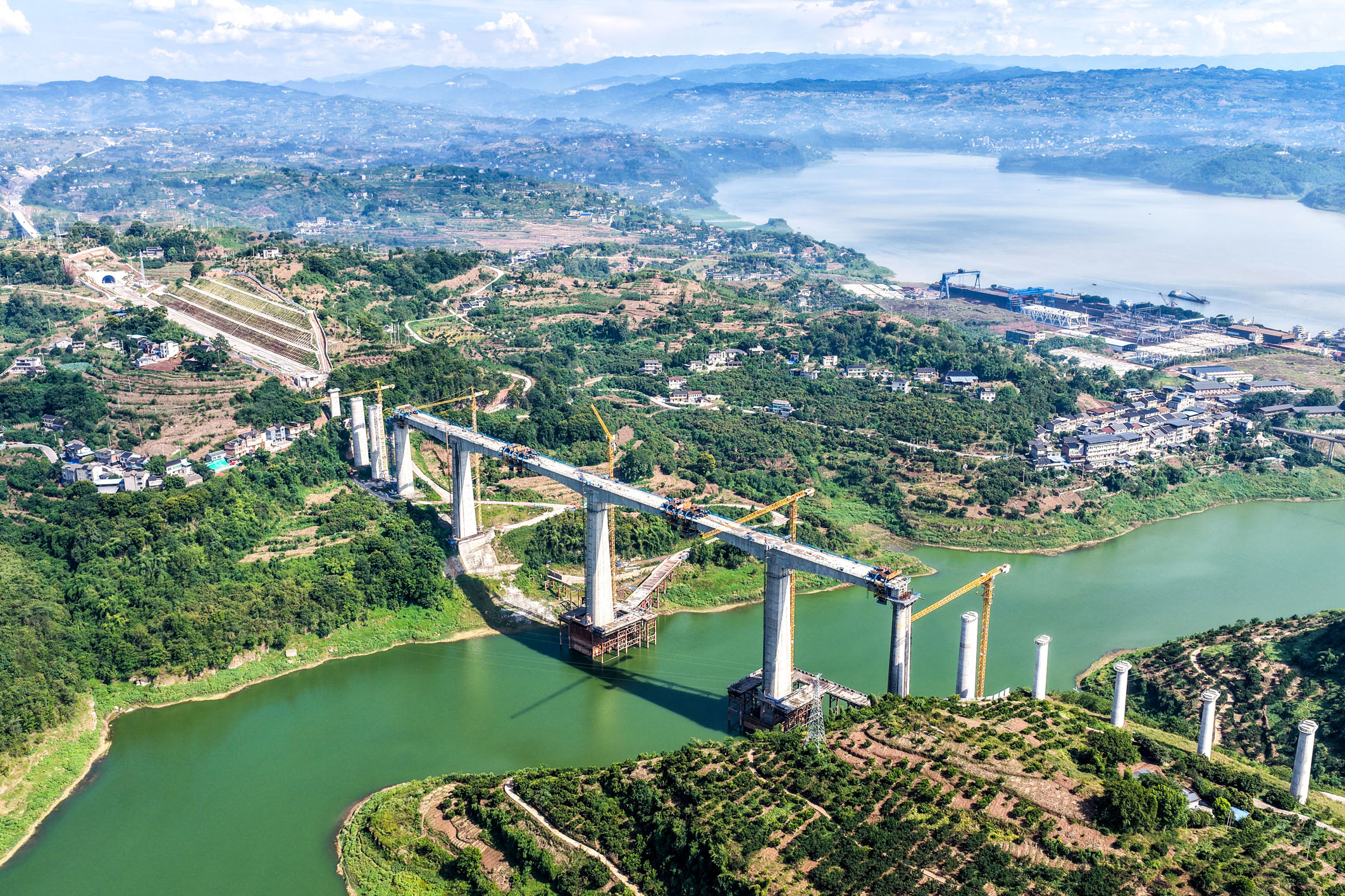 这是8月18日拍摄的渝万高铁渠溪河双线特大桥施工现场(无人机照片)。当日,由中国铁建大桥局承建的重庆至万州高速铁路(渝万高铁)渠溪河双线特大桥顺利合龙。