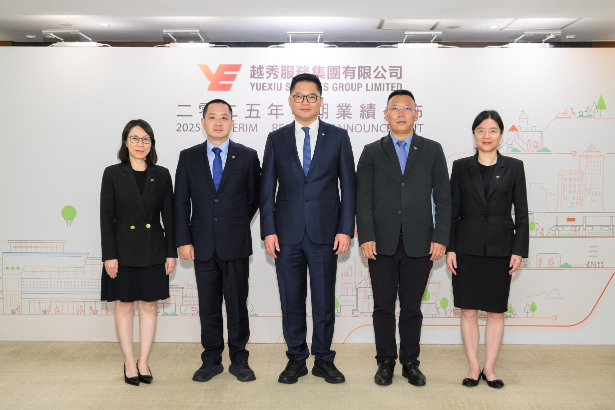 越秀服务非执行董事兼董事会主席–江国雄先生(中)、执行董事兼行政总裁–王建辉先生(右二)、执行董事兼常务副总裁–张成皓先生(左二)、财务总监–李慧婷女士(右一)、资本运营总监–万思蕴女士(左一)