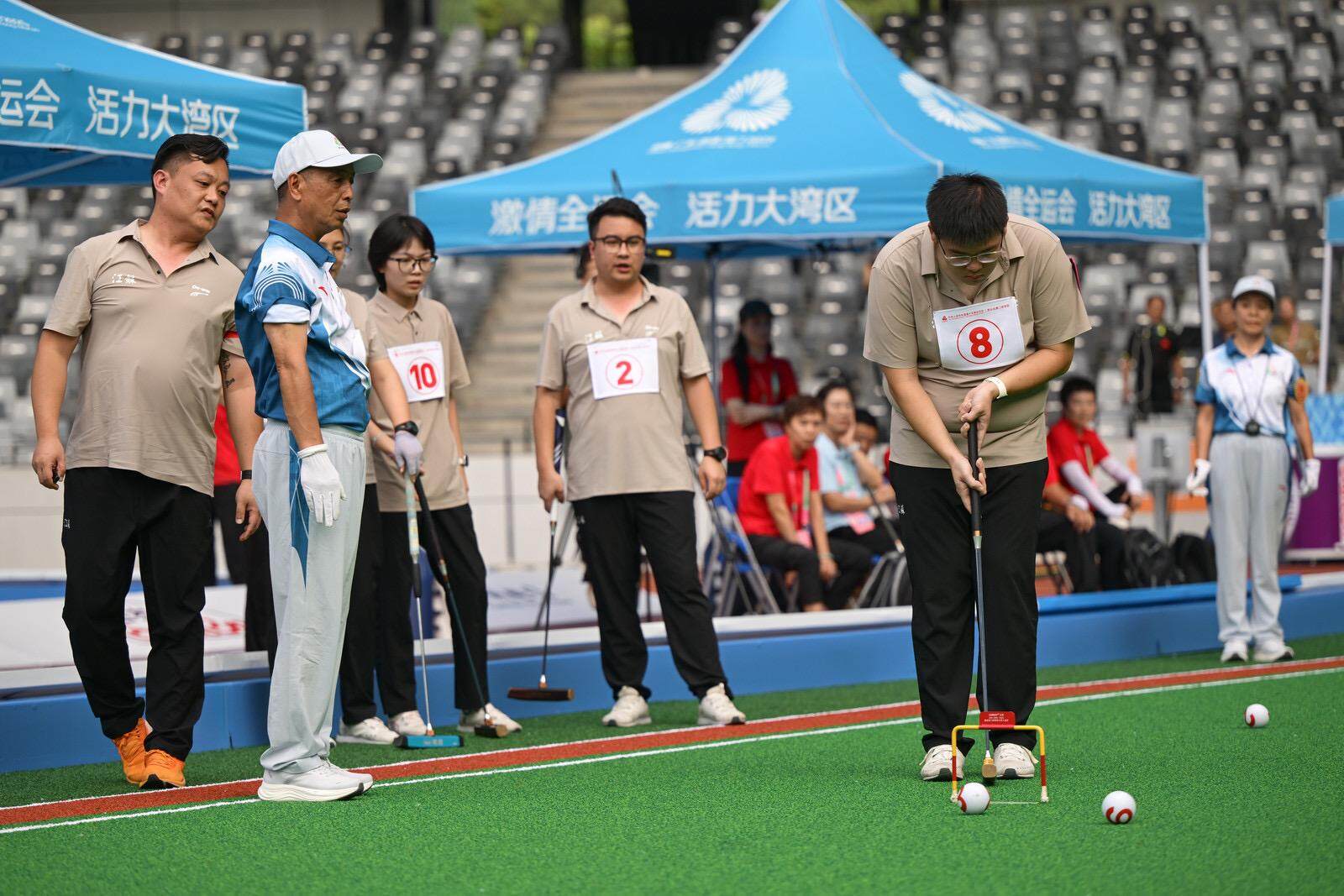 赛场内激战正酣,场外边排起长龙。以“全民全运・同心同行”为主题的运动嘉年华正在如火如荼地进行。门球体验区的六片迷你球场前,市民们跟随专业指导学习如何站位、瞄准、发力,一次次挥杆将球击向门内。“挺有意思的,涨见识了!”一位首次接触门球的市民兴奋地说。动感单车、趣味足球、游泳拉力器、投篮挑战等体验项目也深受市民特别是小朋友的喜爱,集章抽奖环节更让他们兴趣盎然。