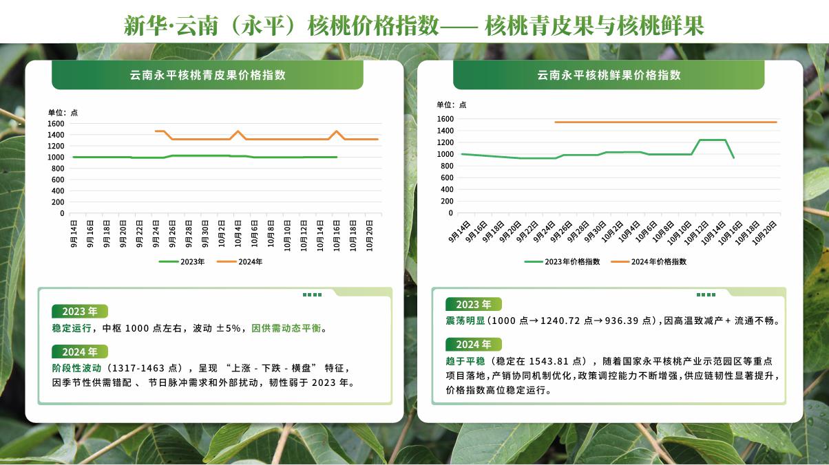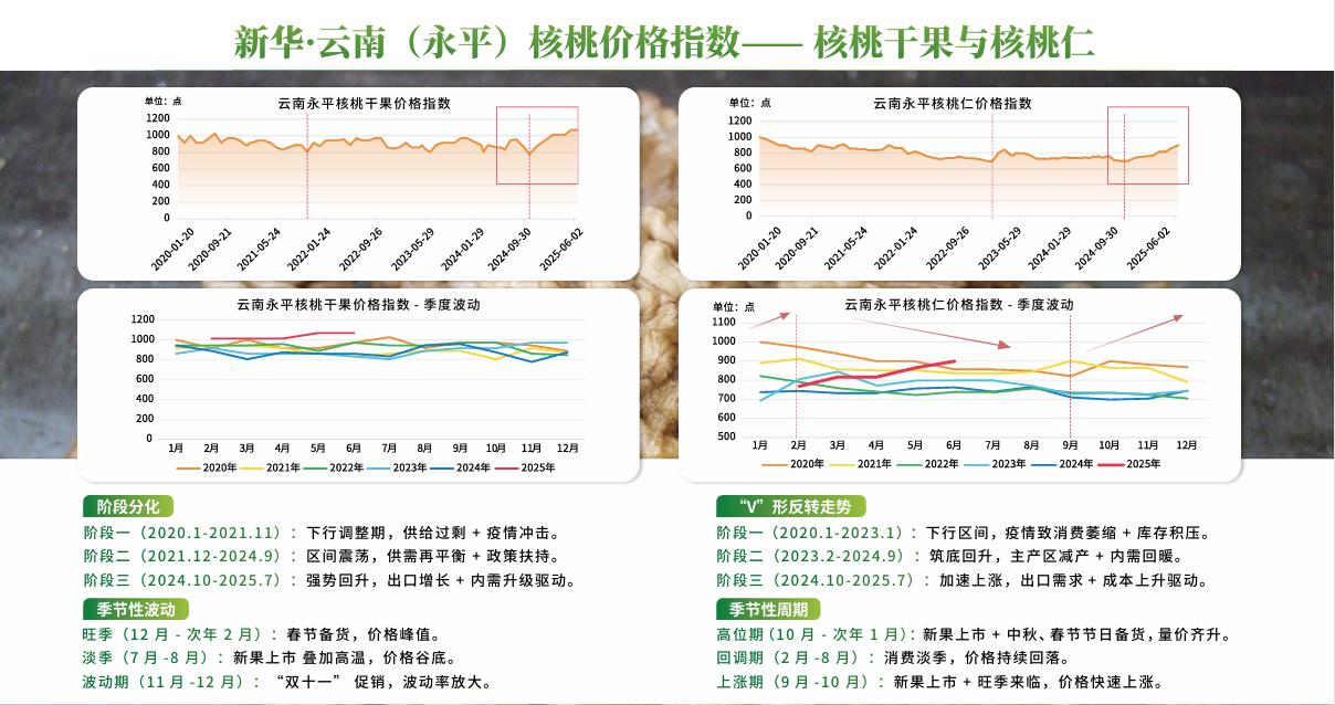 此次发布的“新华・云南(永平)核桃价格指数”,覆盖核桃青皮果、鲜果、干果、核桃仁四大品类,以1000点为基期,采集杉阳镇、厂街彝族乡等8个主产地交易数据,形成动态监测体系,既为种植户提供“以销定产”的数据参考,也推动“优质优价”机制落地,助力当地核桃产业高质量发展。