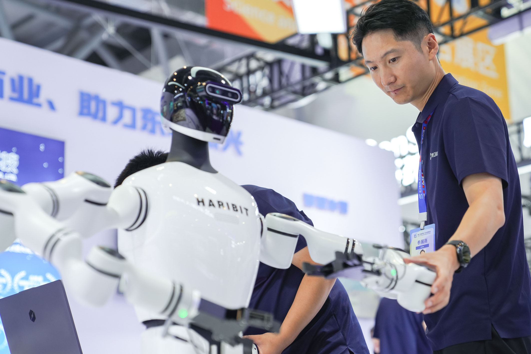 8月27日,第十五届中国-东北亚博览会在吉林长春开幕。图为工作人员在第十五届中国-东北亚博览会现代化产业馆内调试展出的具身智能机器人产品。