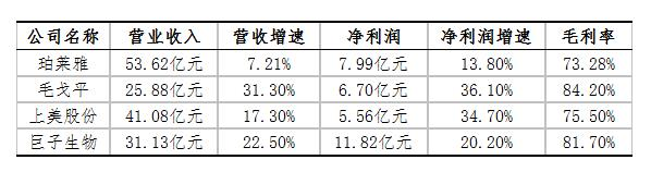 “国货高端美妆第一股”毛戈平上半年营收和净利润同比增长均超30%,成为行业增速最高的企业。中报显示,营收为25.88亿元,净利润为6.7亿元,毛利率高达84.2%。其中,彩妆产品收入占比55%,护肤品业务收入同比增长超30%。