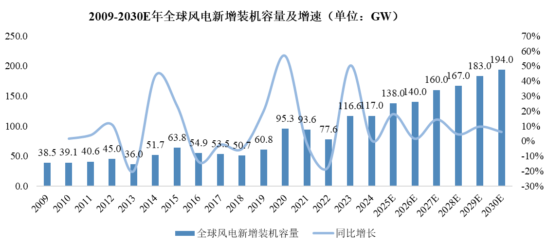 据GWEC数据,2009-2024年全球风力发电新增装机容量整体呈波动上升趋势,年复合增长率为7.69%。2024年,全球风力发电新增装机容量达到117GW,创下了近十年来最高纪录。GWEC还预测,2025年至2030年全球风电新增装机容量的复合年增长率为7.05%,203年预计新增装机容量将增长至194GW。