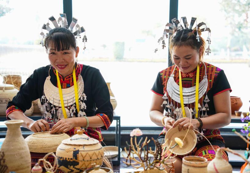 ↑海南黎族同胞在展示黎族藤竹编技艺。新华社记者 樊雨晴 摄