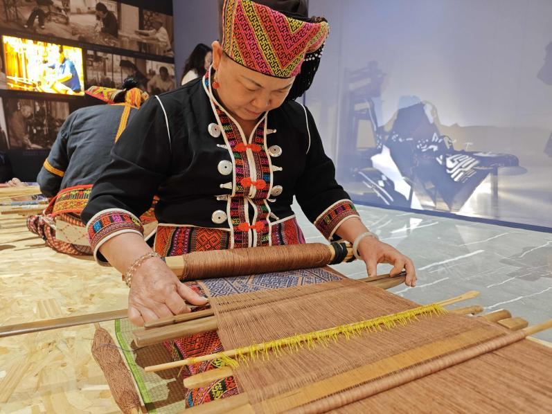 ↑2024年(第四届)海南锦绣世界文化周活动上,刘香兰现场展示织锦技艺。新华社记者 周慧敏 摄