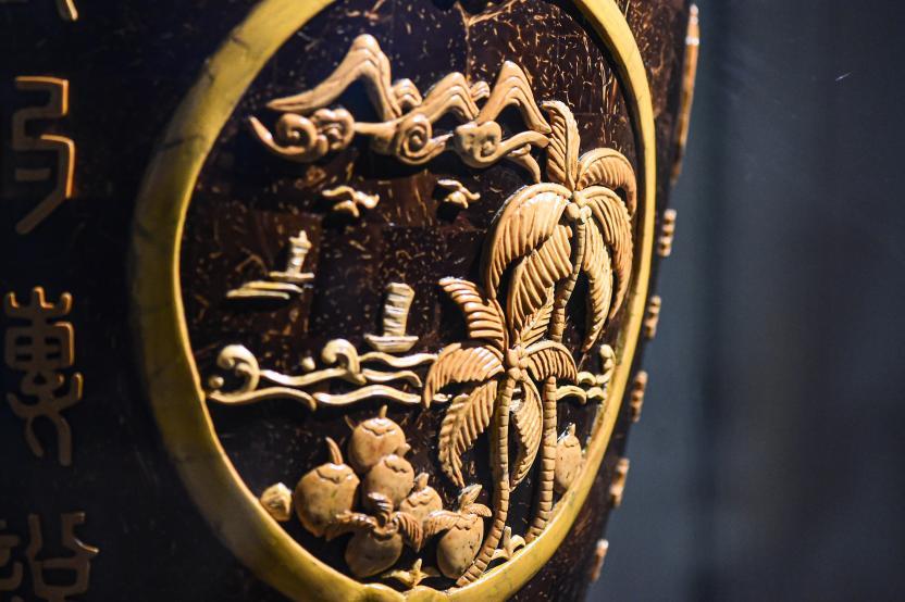 ↑柯秋枫的《椰树传说》椰雕作品细节。新华社记者 蒲晓旭 摄