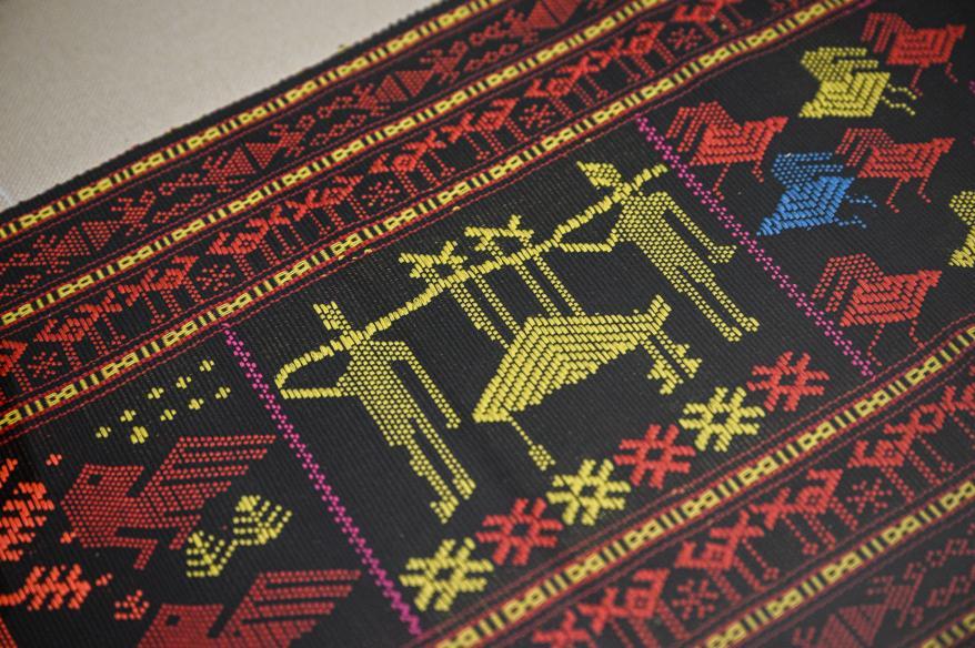 ↑织有黎族生活场景图案的黎锦。新华社记者 蒲晓旭 摄