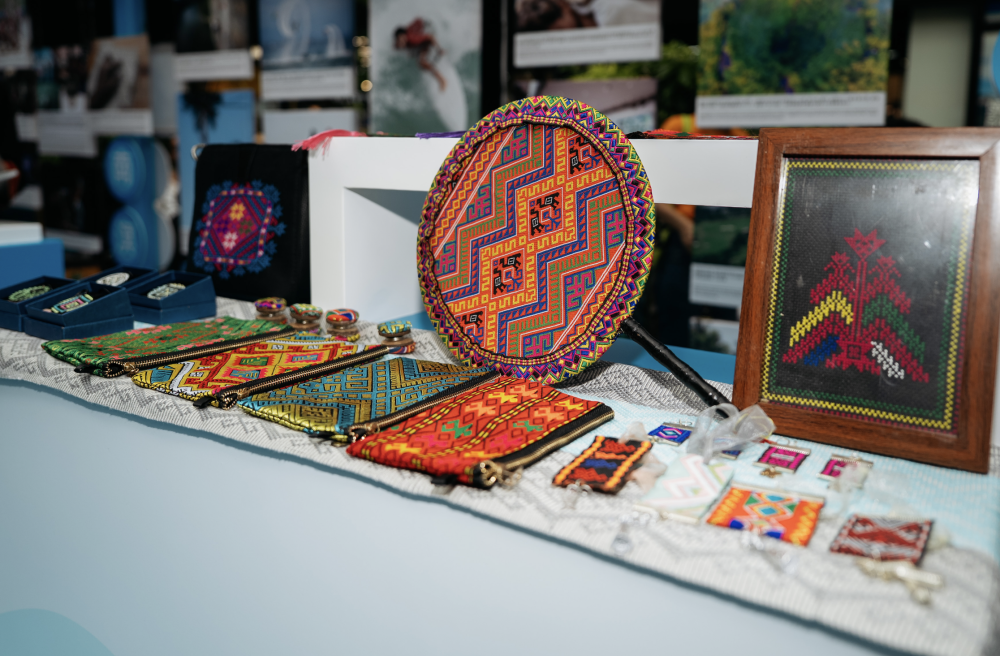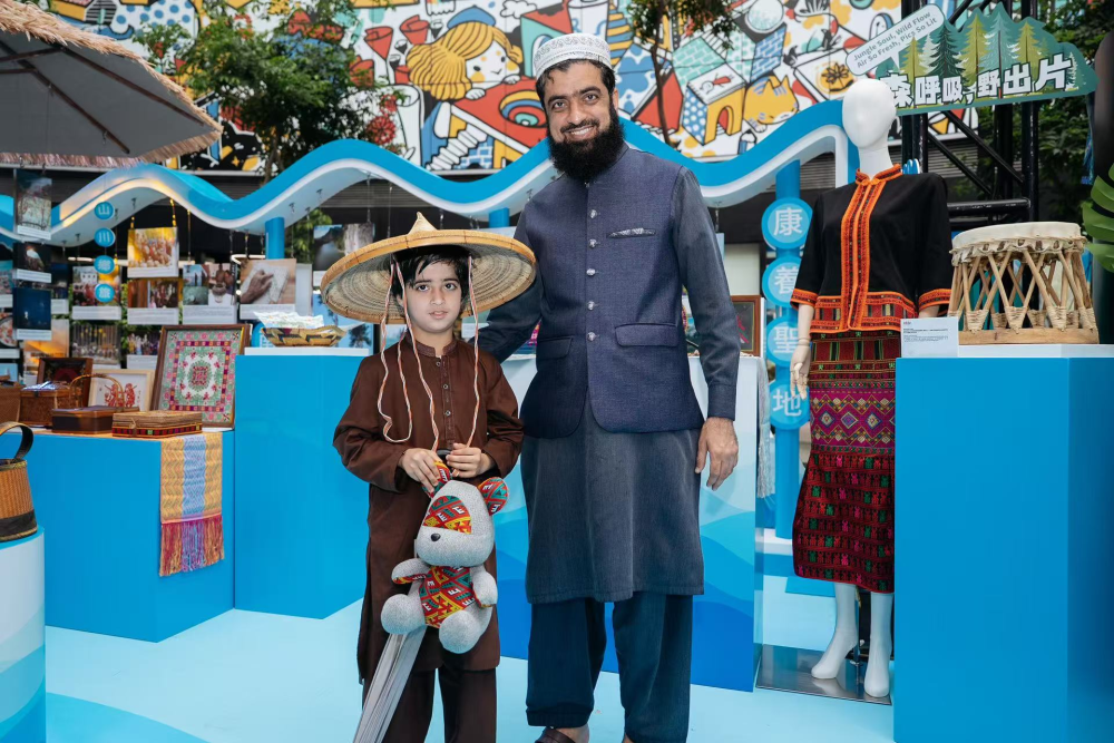 来自美国的艺术家谢敏已在海南生活20余年,她创作的“绿水青山”系列丙烯画作品和黎锦文创饰品,成为展品亮点之一。谢敏介绍,该系列作品以海南长臂猿等特有生物为主题,运用黎锦传统纹样和绿金色调,诠释“绿水青山就是金山银山”的生态理念,引导观众思考人与自然的关系。