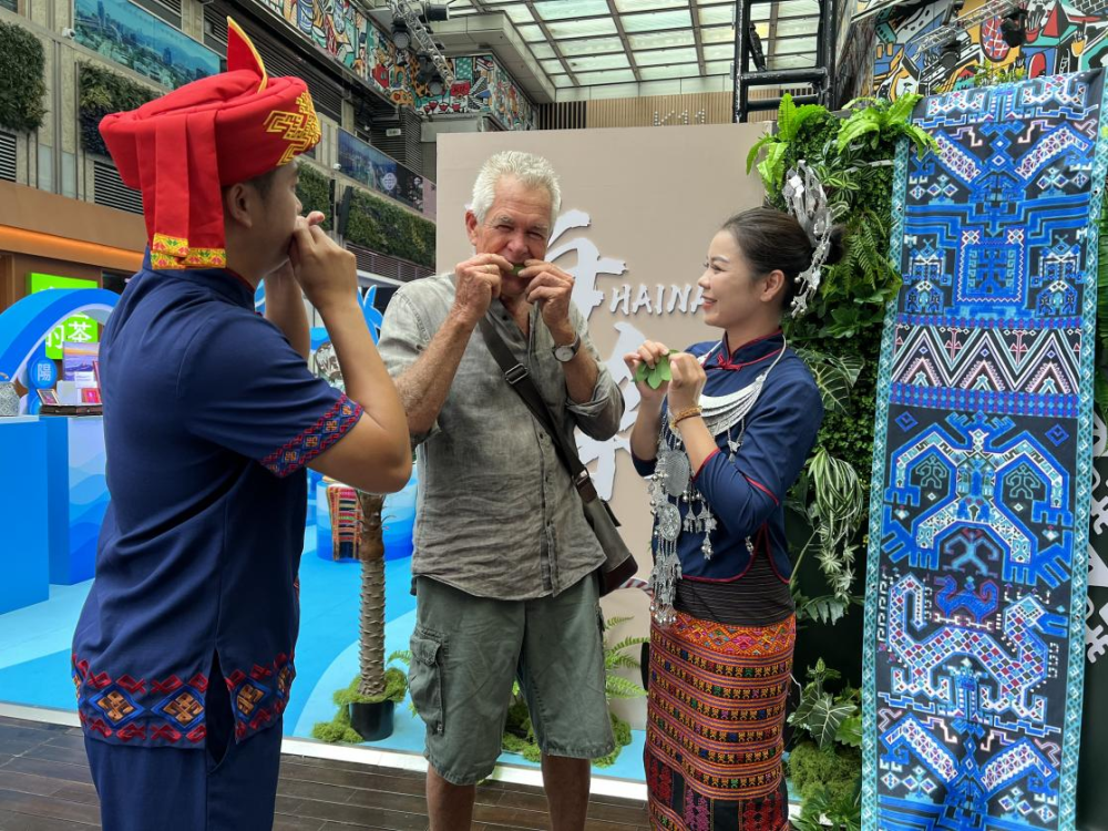 此外,活动的互动体验区更是气氛热烈。“So Beautiful!”加拿大游客Fion de Vletter被演员们身着的海南黎苗民族服饰深深吸引。他原本只计划短暂停留,却沉浸于海南文化魅力之中。在体验树叶吹奏技艺后连连赞叹:“这是从未有过的体验,太有趣了!”表示要计划一场海南之旅。