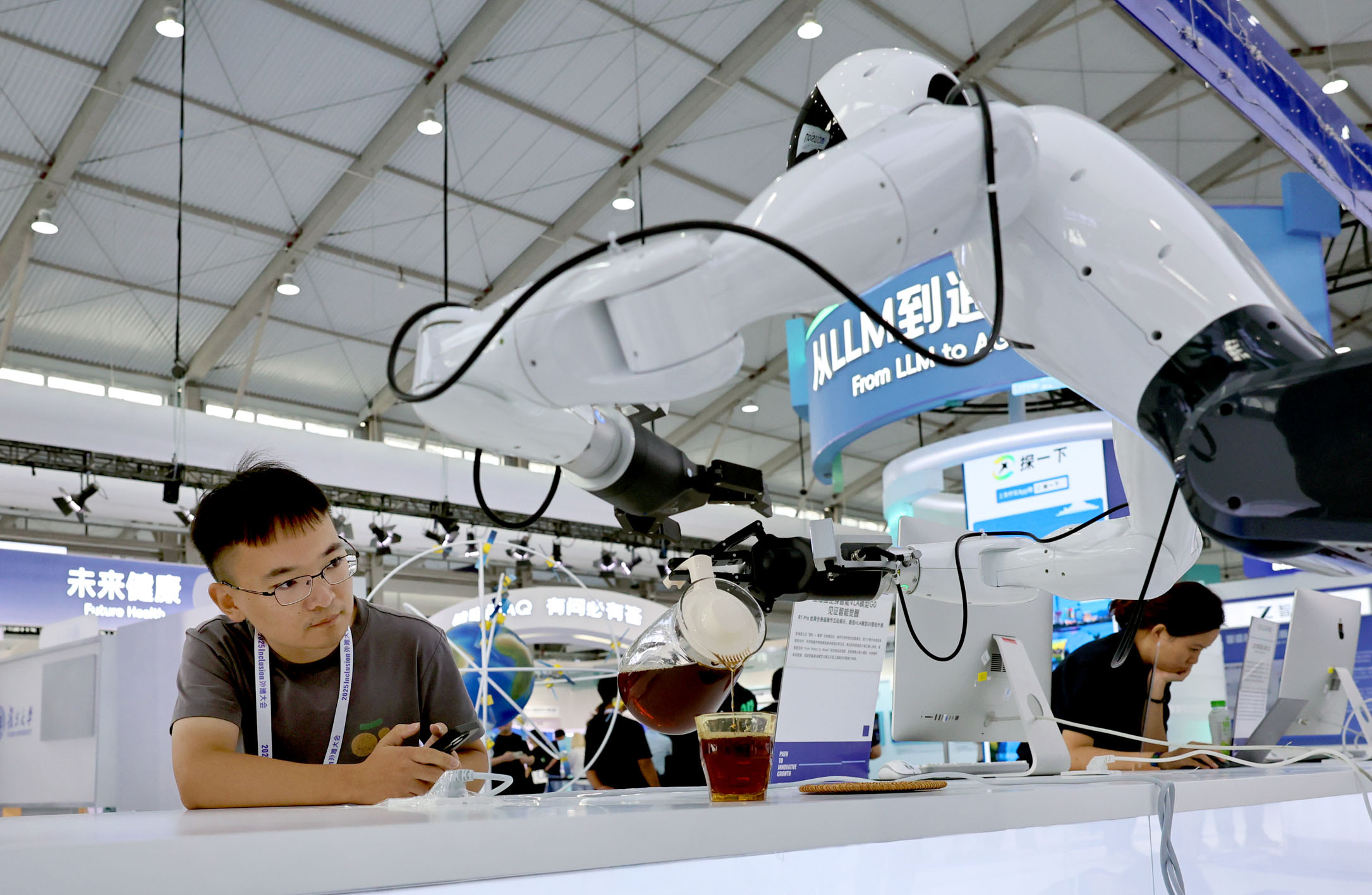 9月10日至9月13日,2025Inclusion·外滩大会在上海黄浦世博园区举行。图为参观者观看机器人演示饮品服务。
