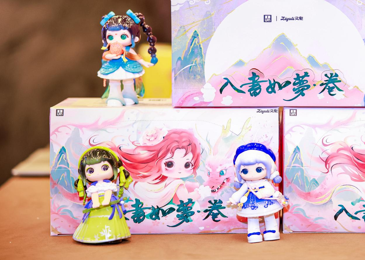 “又梨 入画如梦·卷”系列IP是Letsvan奇梦岛的匠心之作,其角色形象从传统服饰、非遗技艺、古典美学中汲取灵感,将汉服形制、传统纹饰、民俗符号等文化元素进行年轻化、潮流化转化。例如系列中的“青瓷仕女”形象,以宋代青瓷釉色为服饰主调,融合越窑青瓷烧制技艺的文化内涵;“百戏灵童”则提炼传统民间百戏的动作神态,通过Q版萌趣的设计语言,让古代民俗艺术走进当代大众视野;“缂丝仙子”将非遗缂丝“通经断纬”工艺美学转化为服饰纹样;“端午艾娘”把传统民俗具象为IP配饰,用潮玩语言让文化遗产从“博物馆标本”变“社交圈话题”。