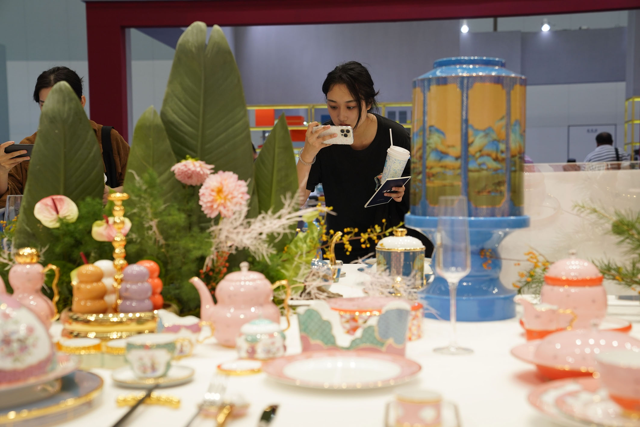 景德镇(江西),参观者正在景德镇瓷博会上拍摄精美陶瓷。新华社记者 周密 摄