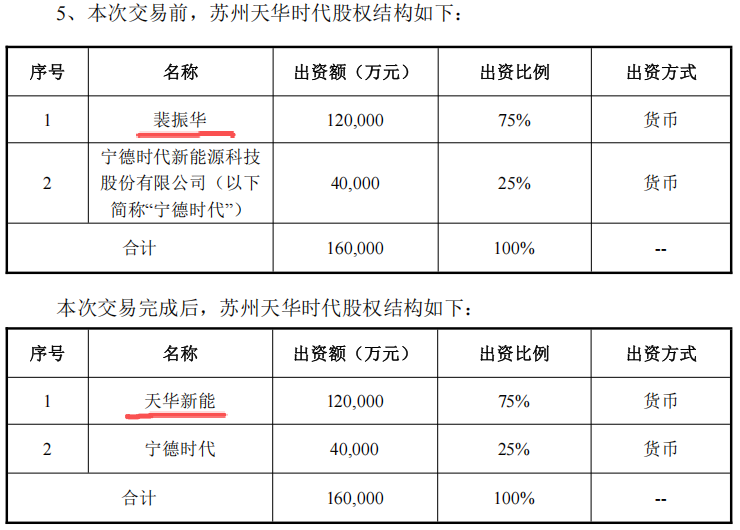 据悉,如若本次交易交割完成,标的公司苏州天华时代将成为天华新能的控股子公司;天华新能持有苏州天华时代75%股权,宁德时代持股比例不变。