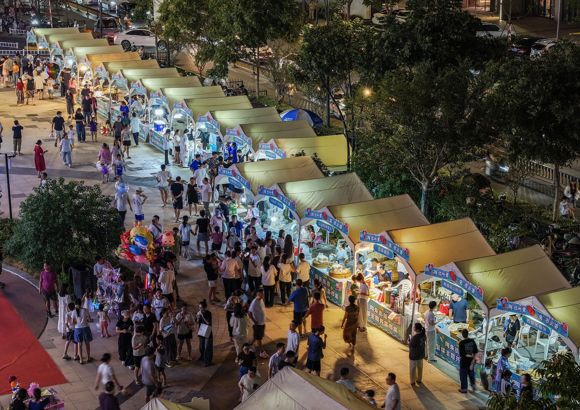 9月16日,“陶你所需·朱市云集”共富市集吸引了大量的市民、游客(无人机照片)。近期,浙江省诸暨市陶朱街道办事处依托“浙BA”这一全省规模最大的群众篮球赛事,举办“陶你所需·朱市云集”共富市集,采用“长期性+周期性”相结合、“固定场地+流动摊位”相补充的灵活开办市集模式,打造“体育+文旅+市集”多元业态融合平台。