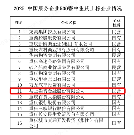 重庆作为我国中西部地区唯一的直辖市,是新时代西部大开发的战略支点、内陆开放的综合枢纽,更是国家服务业扩大开放的综合试点城市。根据大会公布的2025中国服务业企业500强榜单,共有16家渝企上榜。来自重庆的马上消费作为数字金融领域的杰出代表,连续七年入选本次榜单——这不仅是对其经营质量与科技实力的高度认可,也是一家企业与国家战略、行业变革同频共振的生动注脚。