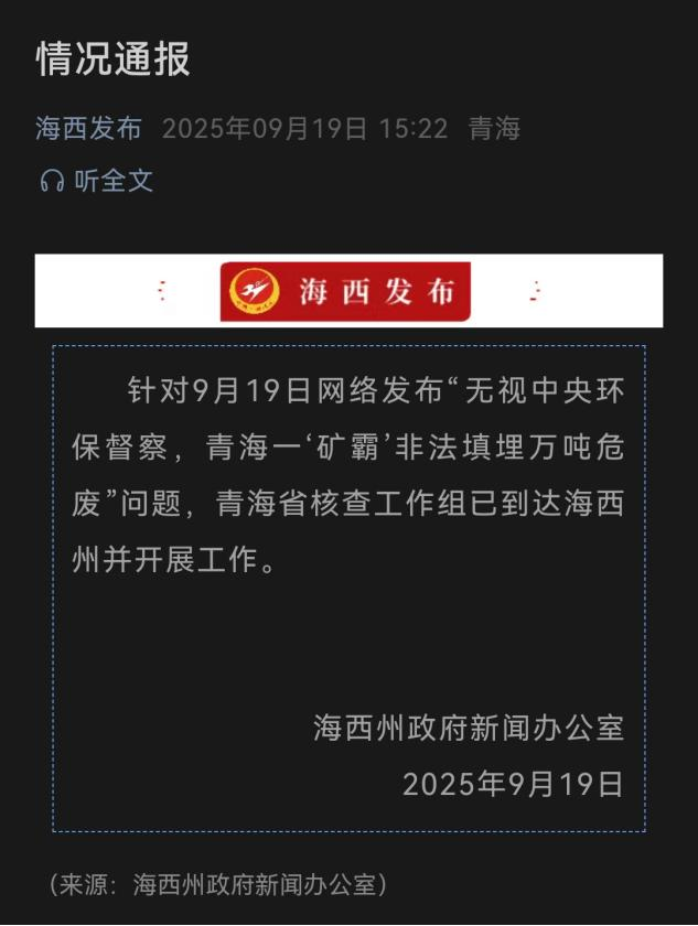 继今日(9月19日)午间,海西州政府新闻办公室宣布就青海柴达木兴华锂盐有限公司被举报非法掩埋大量工业危险废物事件启动核查之后,今日下午3时22分,海西州政府新闻办公室再次发文,针对上述问题,青海省核查工作组已到达海西州并开展工作。