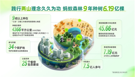 数据显示,自2016年“蚂蚁森林”启动至今,9年来累计用户数达7.5亿,已在全国13个省份种下了6.19亿棵树,种植总面积4366平方公里。为此,蚂蚁集团已累计协议捐资45.66亿元,其中有7.19亿元成为各地种植养护者的劳动收入。(邹易)