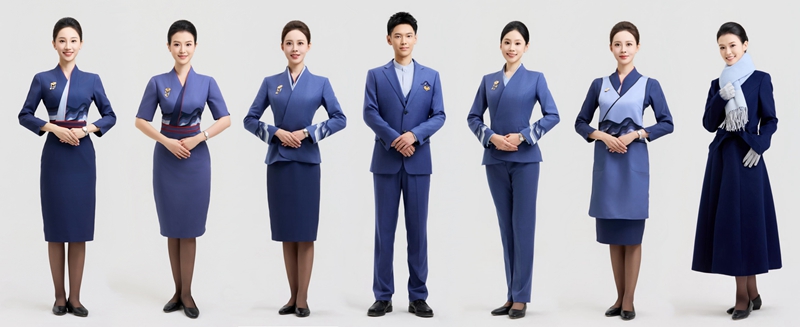 女乘务员可自由选择裙装或裤装,全面换穿平底鞋,提供十余种搭配组合,适应不同航线、气候与个人偏好,实现“各美其美”。过膝裙长兼顾优雅与便捷,平底鞋有效缓解高空作业疲劳,大衣均配羽绒内胆,实现温暖与风度并存。
