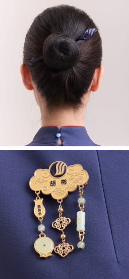 胸牌以“如意”为型,线条温润流畅,既传递对旅客吉祥如意的美好祝愿,也寄托对乘务人员的深切关怀。平安扣圆融如璧,体现“安全第一”的坚定承诺;竹节形态节节攀升,既寓意美好未来的节节高升,也致敬乘务员精益求精的服务精神。这组配饰是文化、服务与温情的凝聚,不仅赋予乘务员更多自信,也让旅客从细节处感知山航的用心与温度。