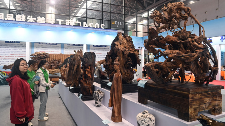 2024年世界林木业大会公众开放日,观众和客商前来参观选购木质工艺美术品。新华社记者 张爱林 摄