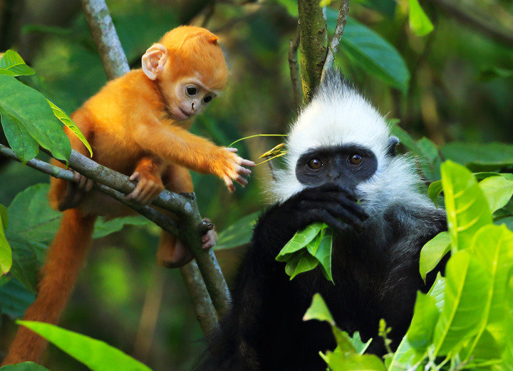 图为白头叶猴雌猴及幼崽。广西崇左白头叶猴国家级自然保护区管理中心 供图
