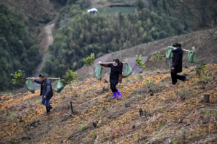 在广西柳州市三江侗族自治县八江镇,人们挑着油茶苗准备上山种植。新华社发 黎寒池 摄