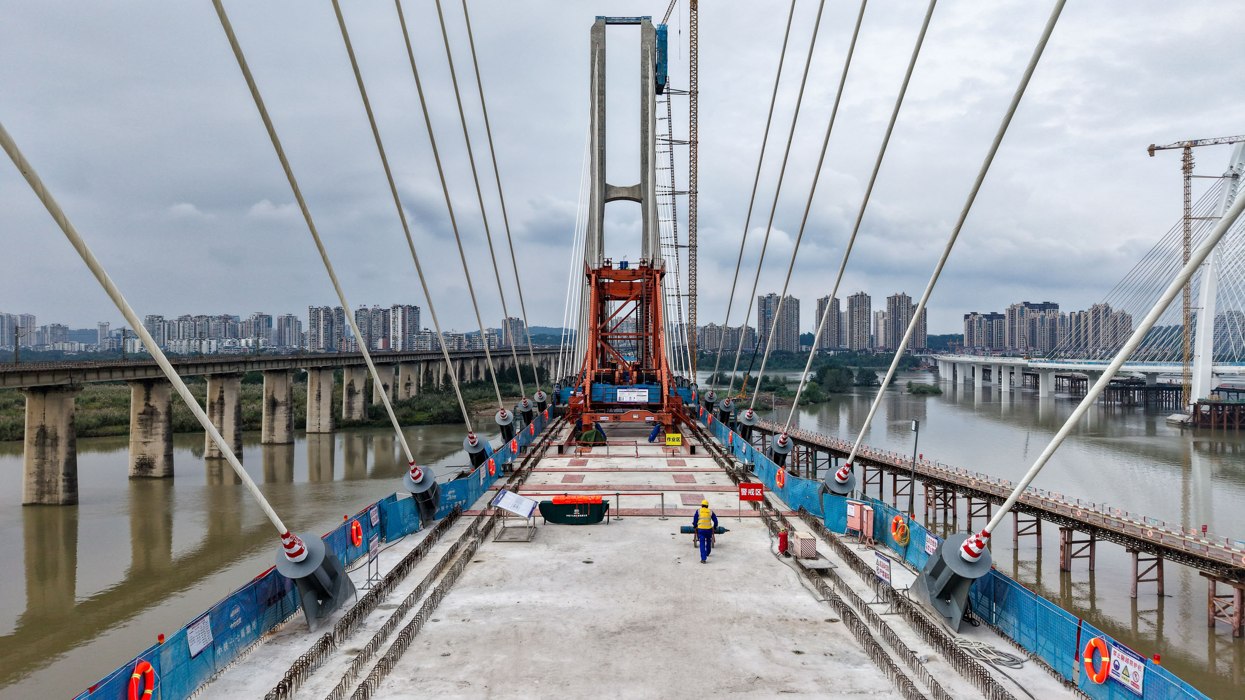 10月14日,成都至达州至万州高速铁路(简称成达万高铁)全线控制性工程遂宁涪江特大桥顺利合龙,为成达万高铁按期通车奠定基础。遂宁涪江特大桥位于四川省遂宁市船山区境内,是全线重难点控制性工程之一,大桥全长5585.4米。图为当日拍摄的成达万高铁遂宁涪江特大桥施工现场(无人机照片)。