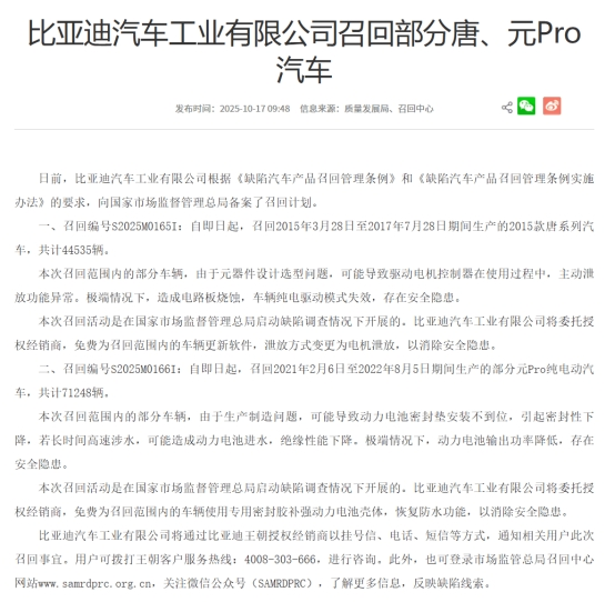 国家市场监督管理总局10月17日发布的消息显示,因元器件设计选型、生产制造等方面的问题,比亚迪(002594.SZ,01211.HK)决定召回部分2015款唐系列汽车及部分元Pro纯电动汽车,合计召回数量为115783辆。