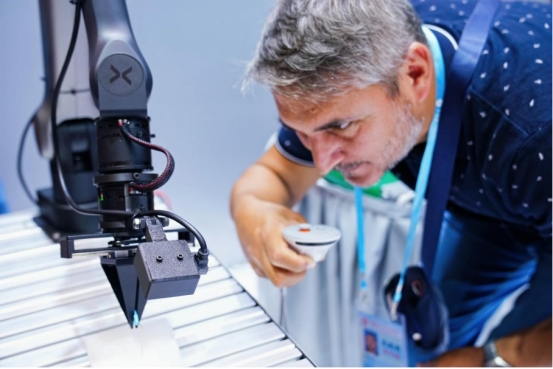展区现场的技术展示与客商互动,正成为这一现象的真实写照。走进机器人展区,一场“穿针引线”的精准展演正在上演——一位白发海外客商在观摩机械臂演示后表现出浓厚兴趣,主动提出体验意愿。在技术人员协助下,他小心翼翼地戴上VIO手柄,专注地盯着屏幕上机械臂的每一个细微动作,当机械臂在他的操控下精准地将细丝穿过直径不足1毫米的针眼时,现场响起阵阵掌声。而一旁来自印度的采购商,为了能与销售深入交流,更是在展台旁排队等了十多分钟,只为听到详细的讲解。
