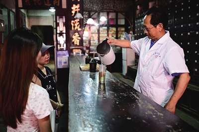 在位于黄山市屯溪区的同德仁药店,坐诊医师为游客制作药茶。新华社记者 周牧 摄