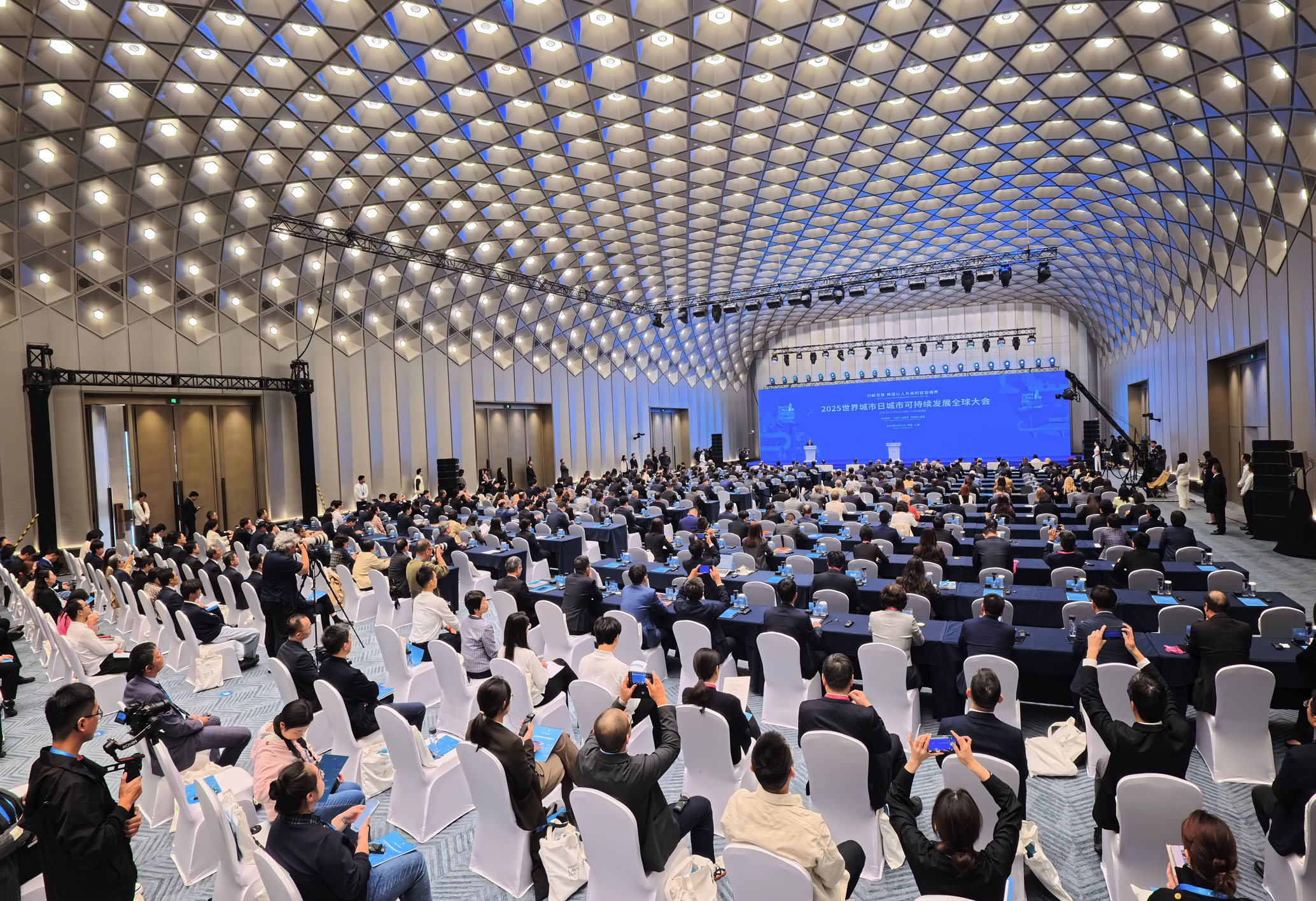 10月26日,2025世界城市日城市可持续发展全球大会在上海世界会客厅开幕,本届大会主题为“创新发展,共建以人为本的智慧城市”。图为10月26日拍摄的2025世界城市日城市可持续发展全球大会全体大会现场。