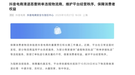 此外,《经济参考报》记者注意到,10月27日,抖音电商安全与信任中心发文宣布清退恶意转单违规物流商。中通快递的子公司中通冷链也在被清退之列。