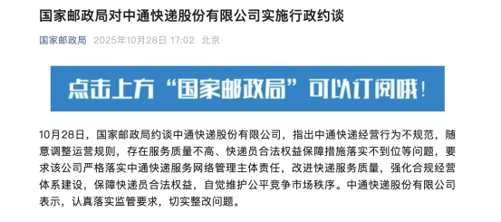 10月28日,国家邮政局官方公众号显示,国家邮政局约谈中通快递股份有限公司(以下简称“中通快递”,02057.HK),指出中通快递经营行为不规范,随意调整运营规则,存在服务质量不高、快递员合法权益保障措施落实不到位等问题。