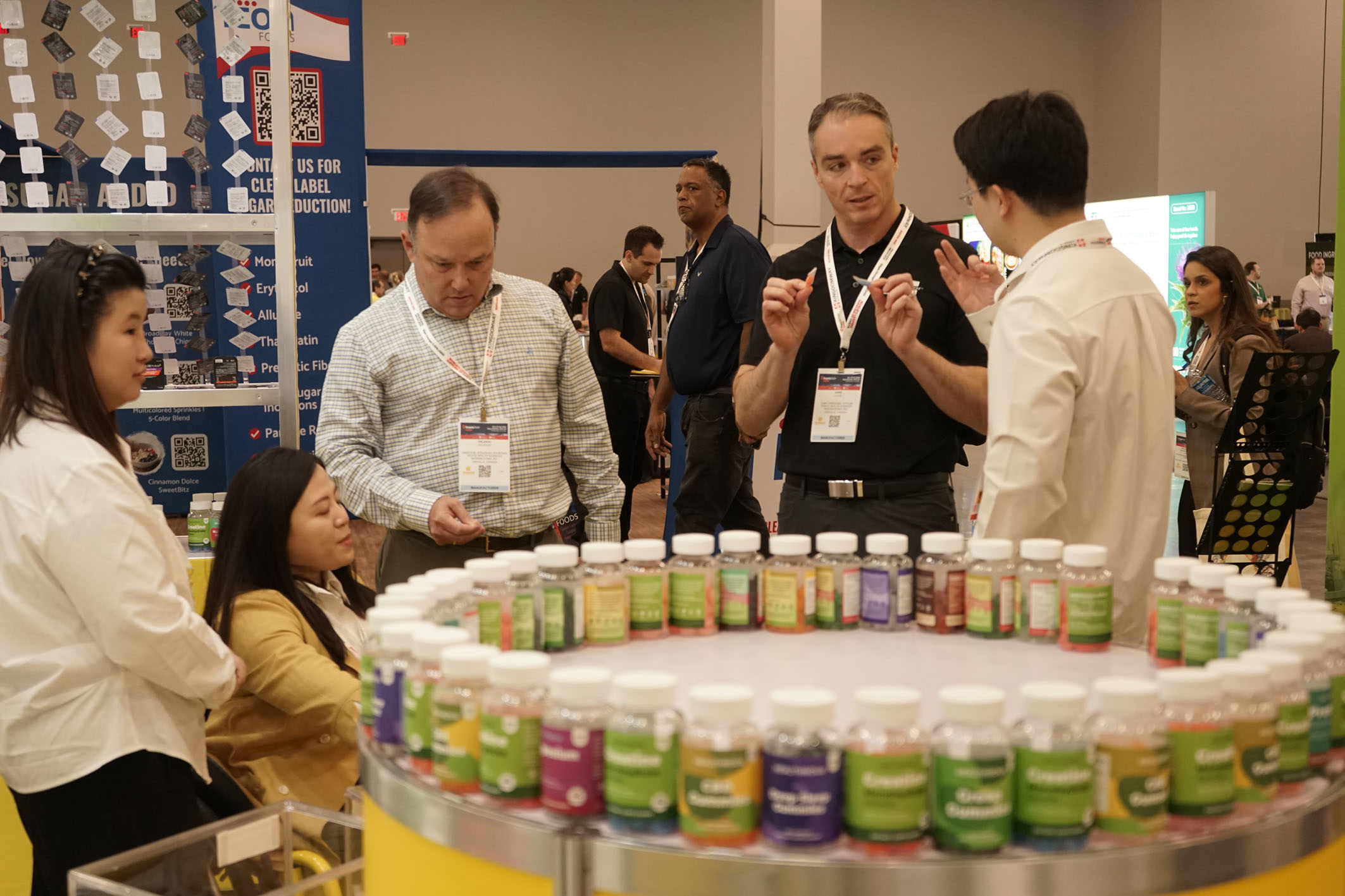 2025年中国创新健康原料品牌展10月29日在美国拉斯维加斯开幕。约80家中国企业集中亮相,展示中国在健康产品原料、创新研发、生产技术及数字化贸易平台等领域的最新成果。图为参会者在中国企业展台洽谈交流。