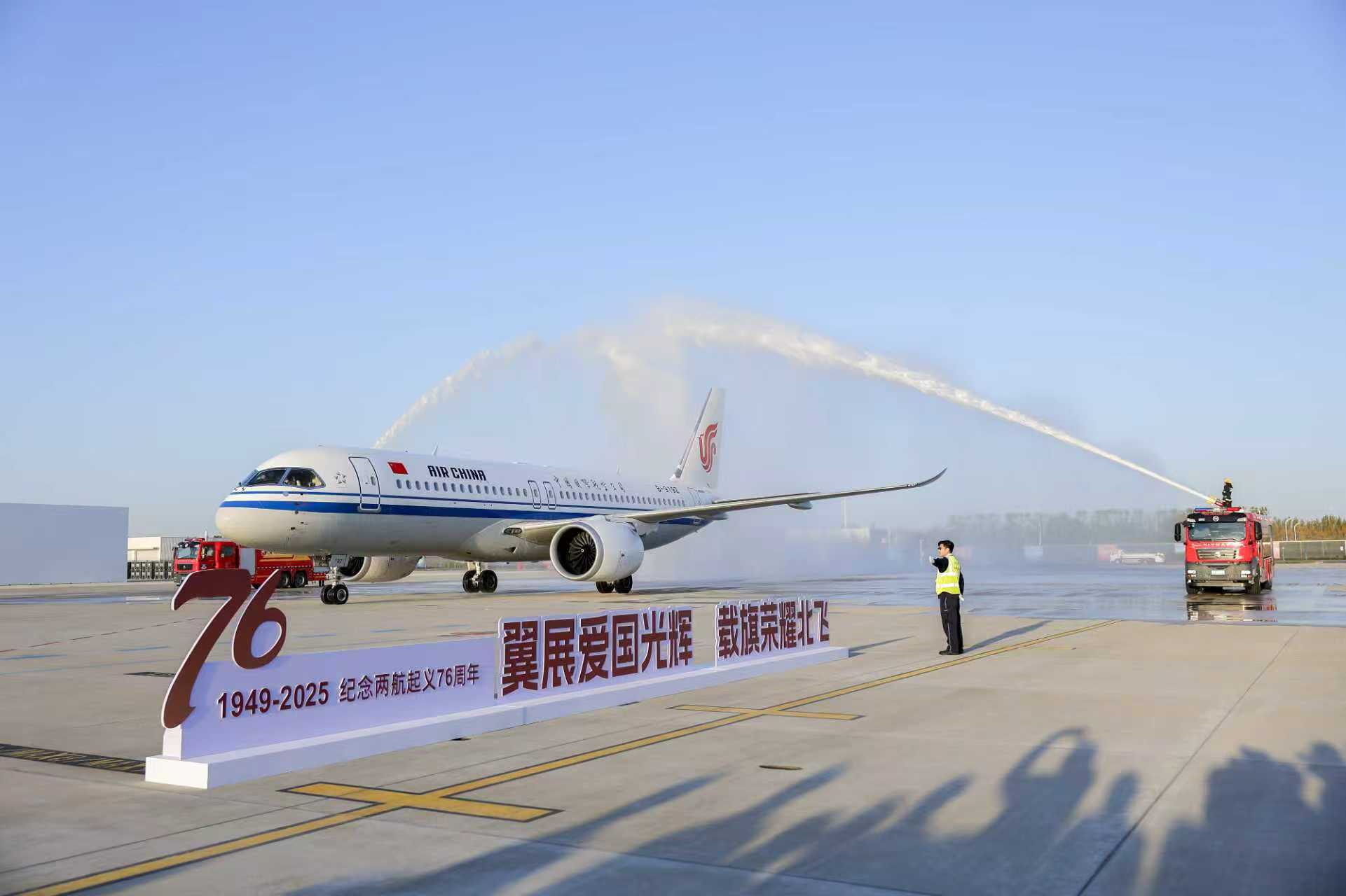 11月9日,为纪念“两航起义”76周年,中国航空集团有限公司(以下简称“中航集团”)举办“翼展爱国光辉 载旗荣耀北飞——国航C919重飞‘两航起义’北飞光辉航程”系列主题活动。
