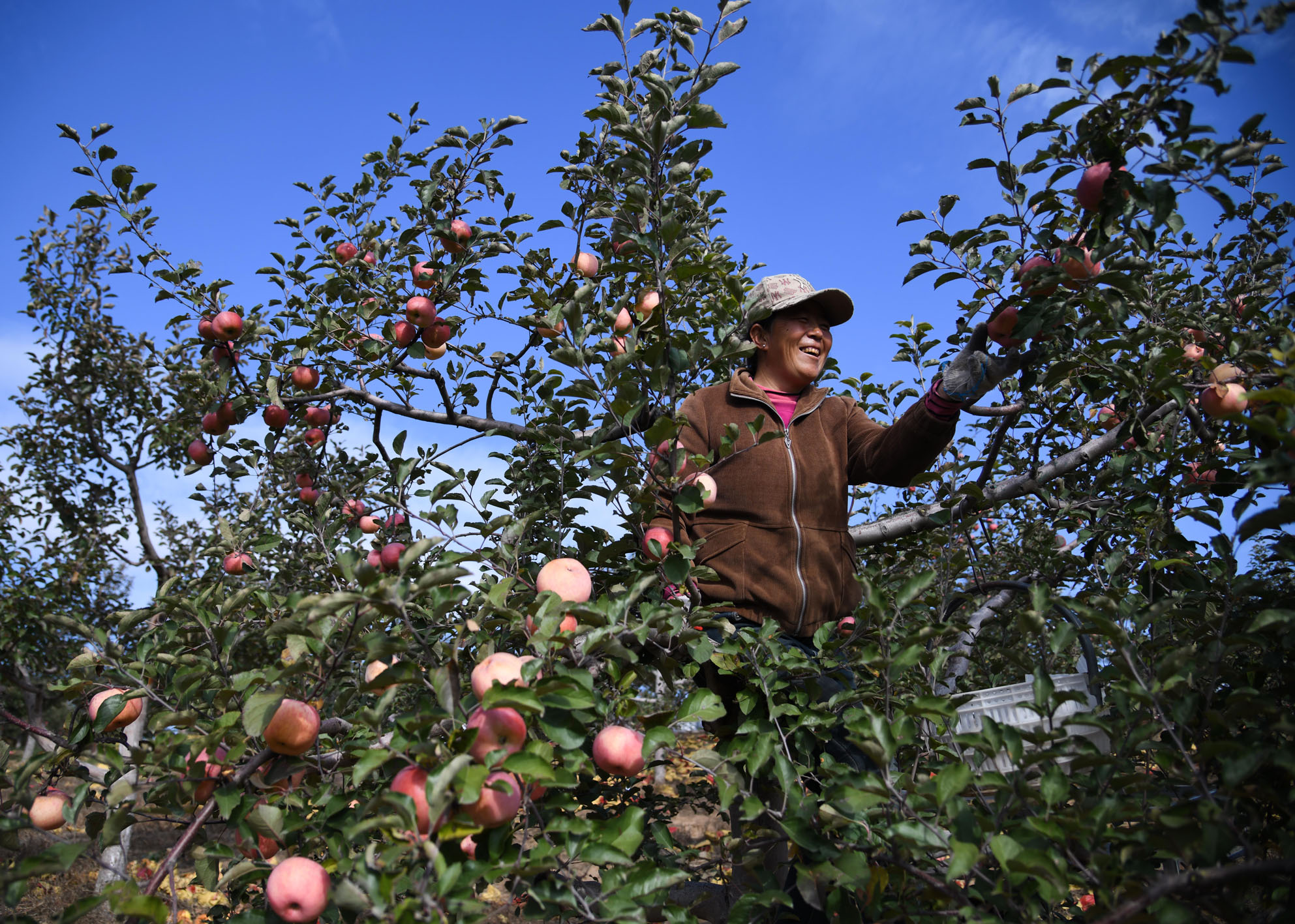 11月4日,果农在陕西省榆林市横山区赵石畔镇一处果园采收苹果。近期,位于毛乌素沙地南缘的陕西省榆林市迎来苹果收获季,果园中一派忙碌景象。几十年来,榆林市坚持植树造林、防沙治沙,使绿色版图不断扩大,持续改善的自然环境为榆林苹果产业发展打下坚实的生态基础。2025年,榆林山地苹果种植面积达116万亩,实现了环境保护与经济发展协同并进的产业发展模式。(全文详见第三版)