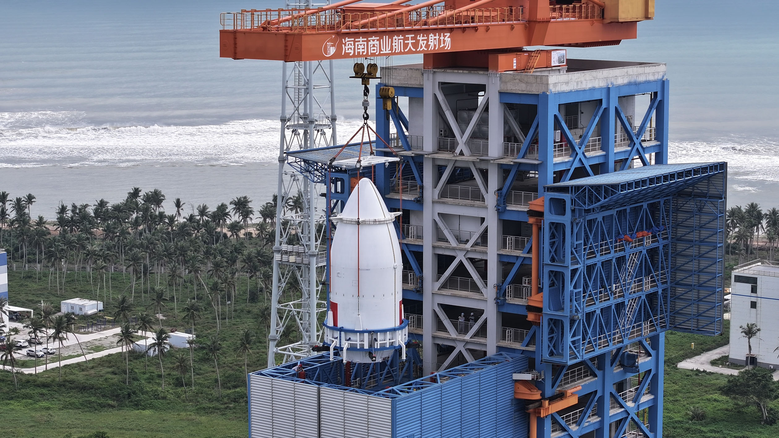 图为11月11日拍摄的长八甲遥五火箭整流罩吊装作业现场(无人机照片)。