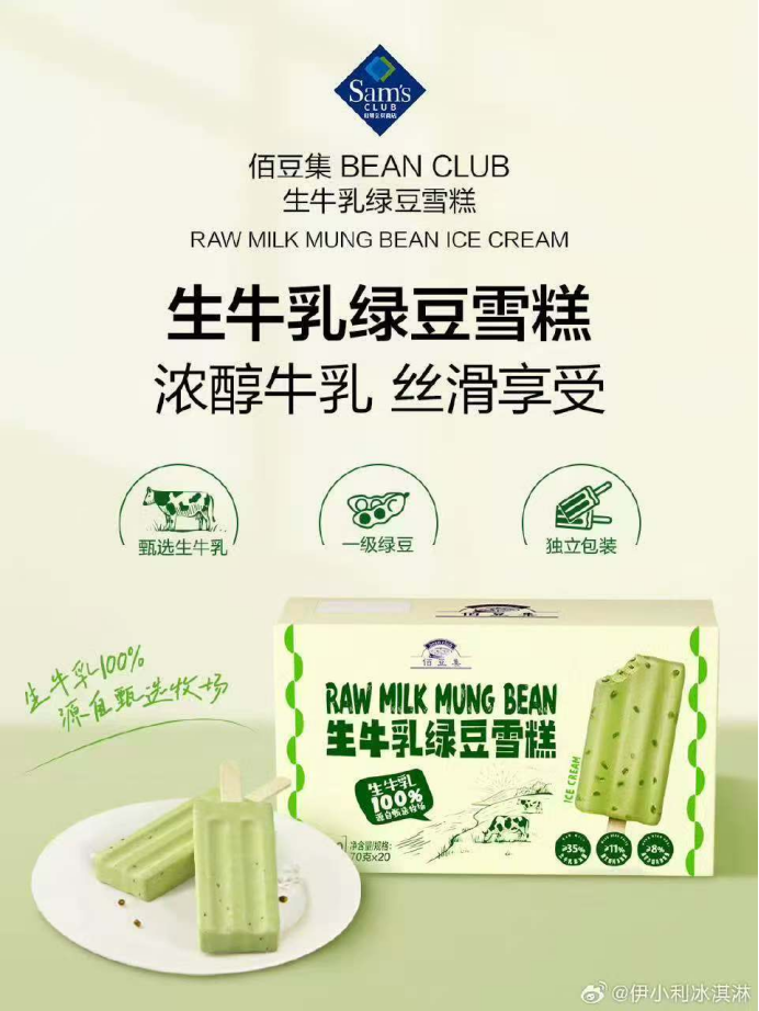 2025年3月,伊利、山姆共创的“生牛乳绿豆雪糕”实现首批量产,并迅速搬上山姆货架。