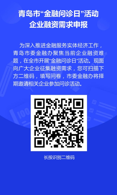 “金融问诊日”活动共分为问诊需求征集、问诊活动组织、问诊服务跟踪三个阶段。问诊前,青岛市委金融办会同各相关单位广泛征集企业融资需求,企业可扫描“企业融资需求申报二维码”(下图)进行申报。每周四下午,青岛市委金融办邀请企业、行业主管部门以及银行、保险、担保等金融机构,在青岛资本市场服务基地,开展现场问诊或视频问诊。金融机构共同分析企业财务状况、经营模式、融资需求等情况,为企业推介适宜的金融政策、信贷产品、服务模式,提供综合性专属融资方案,实现“能贷快贷”“应贷尽贷”;对于暂时无法提供金融支持的企业,讲明问题原因、提出改进建议,做到“难贷讲清”。问诊后,青岛市委金融办持续做好“一对一”跟踪服务,进一步完善工作闭环。