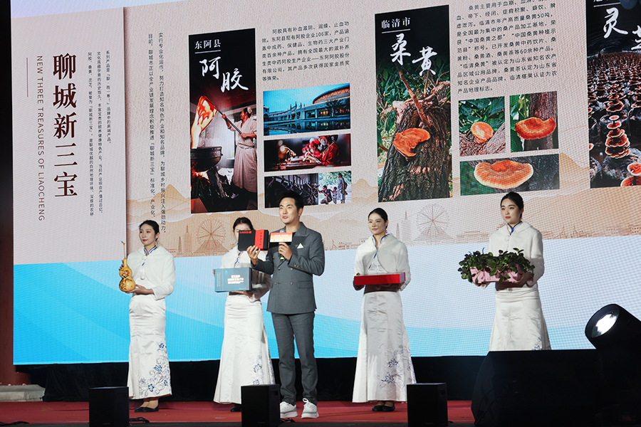 前门·中华美食荟山东周暨“两河明珠 ‘京’彩绽放”山东聊城文商农旅北京宣推活动开幕式上,演员张晓龙推介“聊城新三宝”