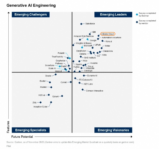 2025年11月中旬,国际权威市场研究机构Gartner发布4篇GenAI(生成式AI)技术创新指南系列报告,公布了GenAI云基础设施、GenAI工程、GenAI模型以及AI知识管理应用四大维度的新兴市场象限(Emerging Market Quadrant),阿里云在四大维度均位于新兴领导者象限。