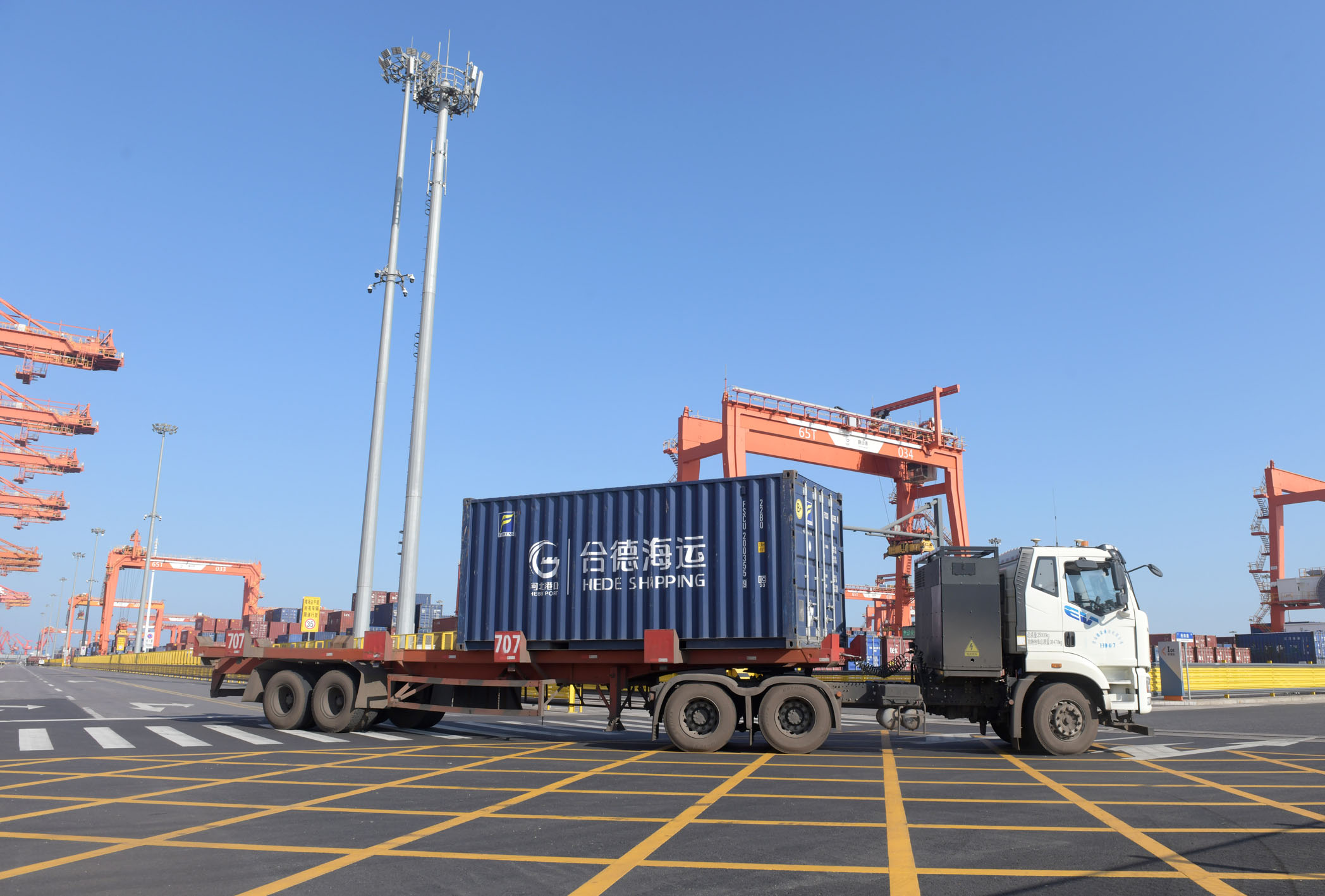 图为一辆电动重卡在唐山港京唐港区集装箱码头堆场运送货物。新华社记者 卢汉欣 摄