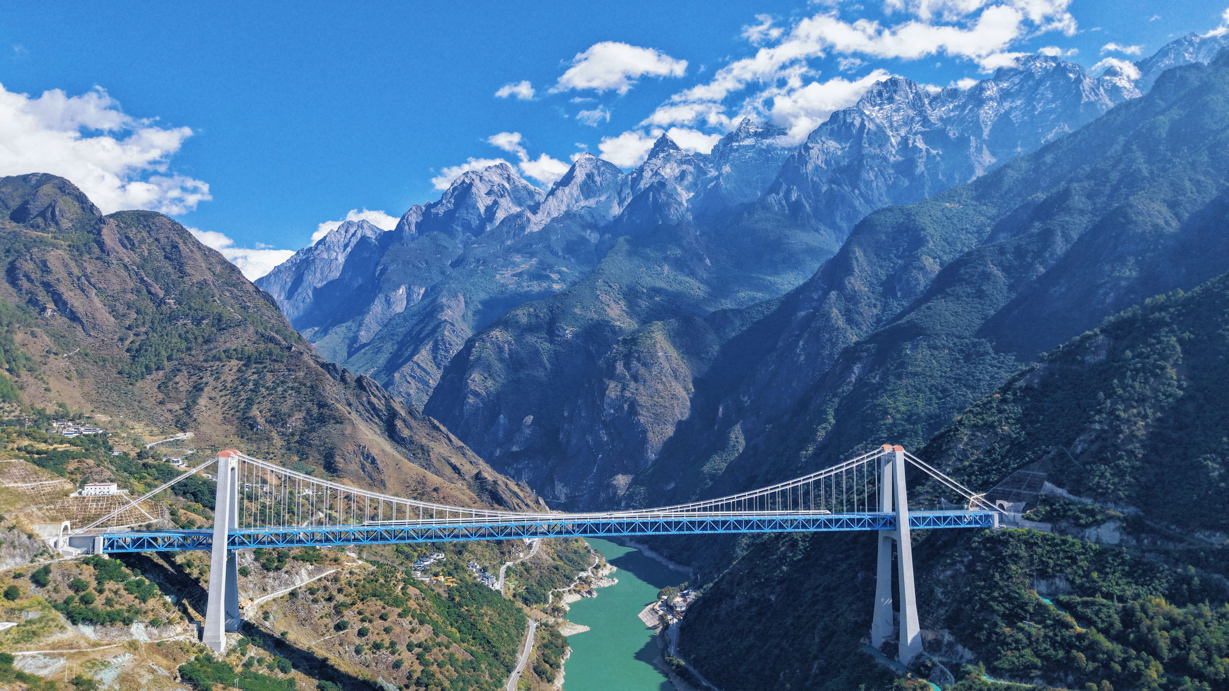这是11月21日拍摄的虎跳峡金沙江铁路大桥。大桥全长882.5米,起于玉龙雪山隧道出口,止于哈巴雪山隧道进口,是丽香铁路的重点控制性工程(无人机照片)。2025年11月26日,我国滇藏铁路重要组成部分——丽江至香格里拉铁路(下称“丽香铁路”),将迎来开通运营两周年。这条连接丽江与香格里拉的“云岭天路”全长139.7公里,结束了云南迪庆藏族自治州不通铁路的历史。